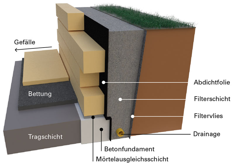- Wird aufgrund mangelnder Entwässerungseigenschaft des bestehenden Bodens eine Drainplatte oder eine Filterschicht (z.B. Kies 8/16 cm) eingebaut, empfehlen wir ein Filtervlies zum Schutz der Filterschicht vor Verschlämmung mit Feinmaterial zu verwenden.