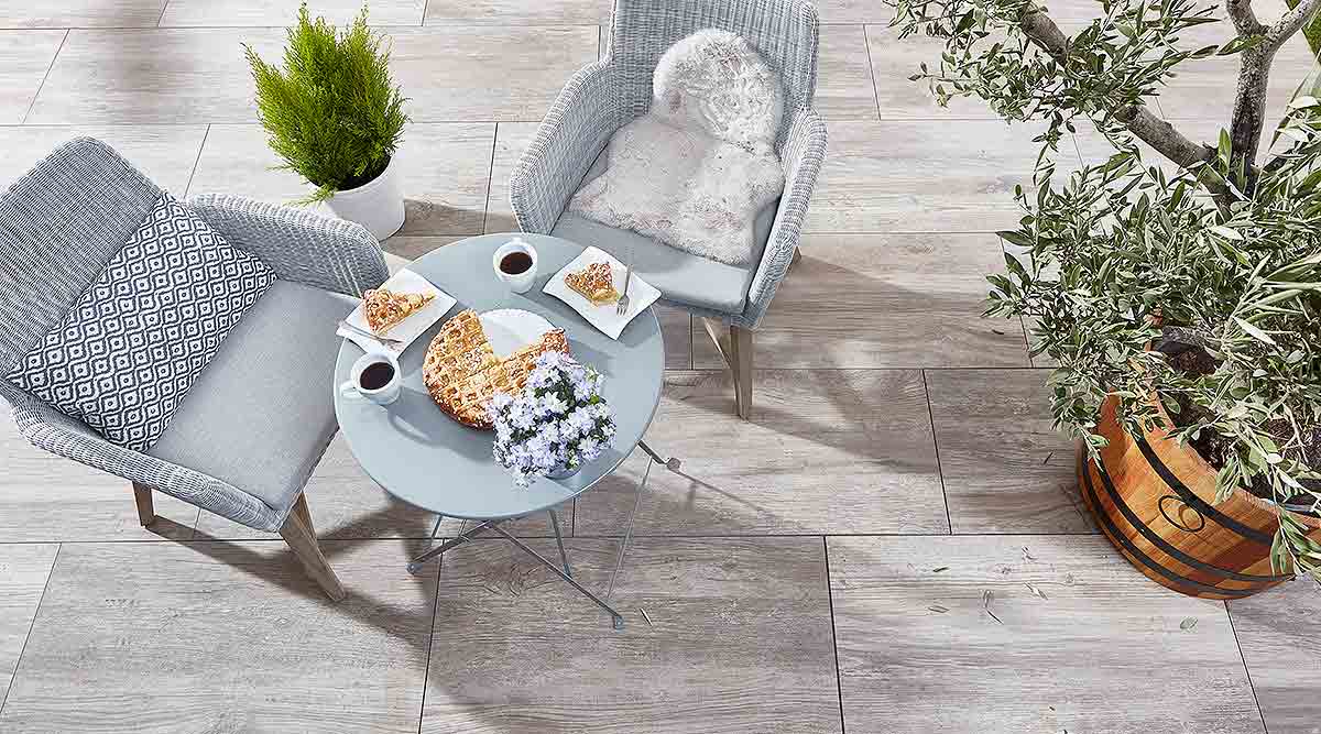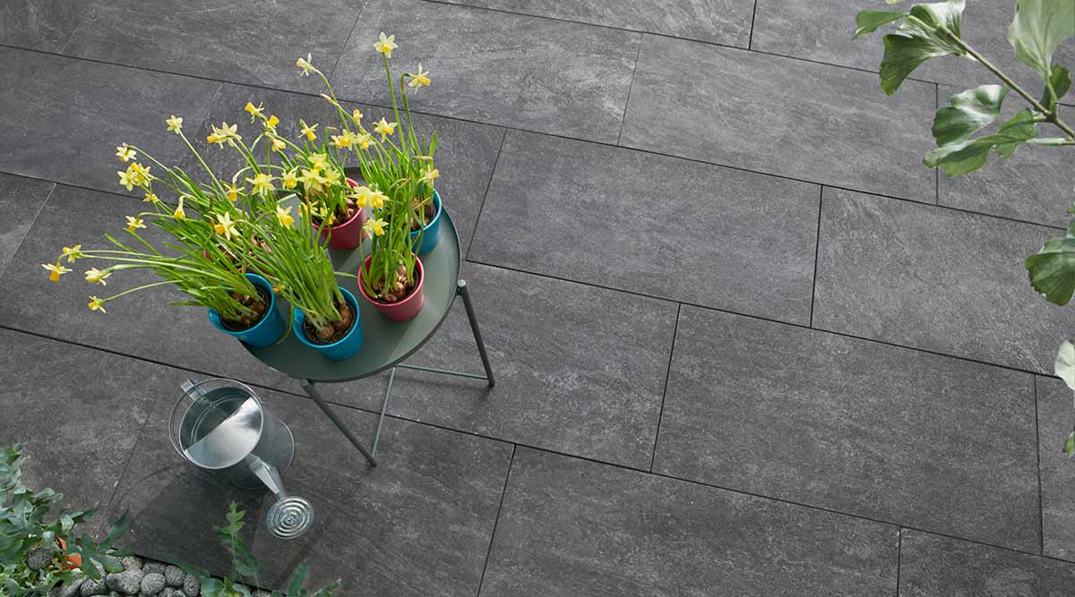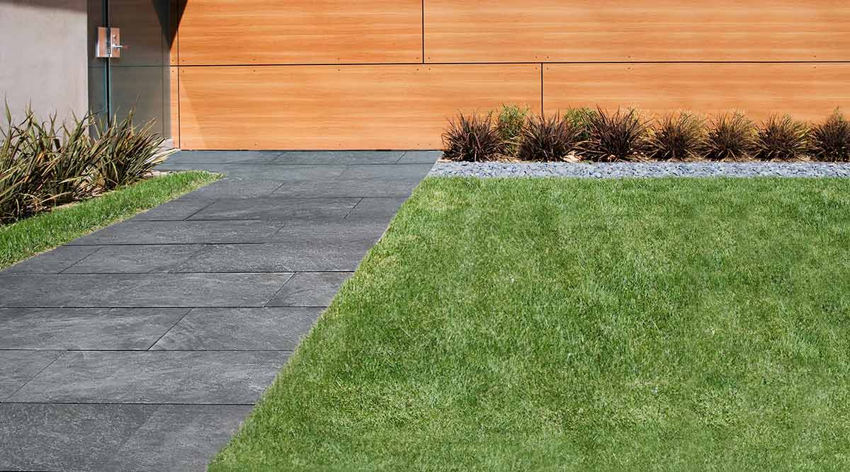 Die neue Feinsteinzeug-Massivbeton-Verbundplatte vereint alle Vorteile einer Außenkeramik-Oberfläche (pflegeleicht, kratzunempfindlich, dauerhaft farbbeständig) mit der kostengünstigen, einfachen Verlegung einer Betonplatte. Ohne Abstandhalter ist die Platte auch optimal für die Verwendung unkrautfreier, „fester Fugen“ geeignet.